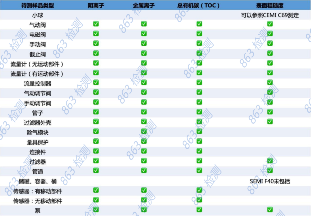 863检测具备丰富的F57测试经验,协助半导体聚合物及相关组件供应商,以及化学品输送生产设计企业满足SEMI标准要求,尤其在元素分析、阴离子分析等方面有先进前处理方法,确保结果的准确性。863检测拥有专业的技术团队和丰富的半导体测试经验、完善的服务内容和服务网络,能为企业提供专业的咨询和测试服务。