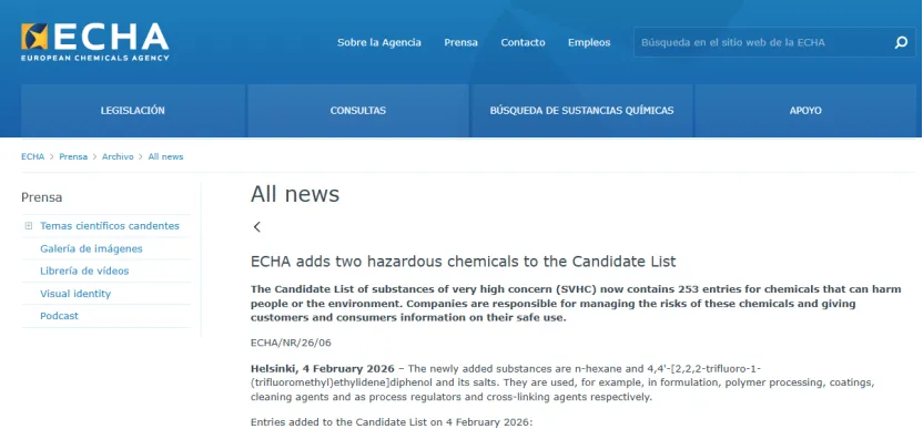 2026年2月4日,欧洲化学品管理局(ECHA)正式更新SVHC候选物质清单,将正己烷和4,4’-[2,2,2-三氟-1-(三氟甲基)亚乙基]双酚(BPAF)及其盐两项物质加入到SVHC候选物质清单。SVHC候选清单共包括36批253个正式物质,1个待定物质。