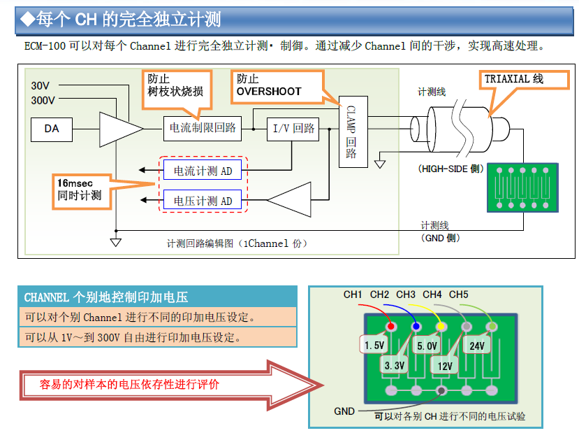每通道独立实现电压输出、数据测量、过流保护功能,通道间无干扰,且所有通道均可共极(GND)进行测试 |